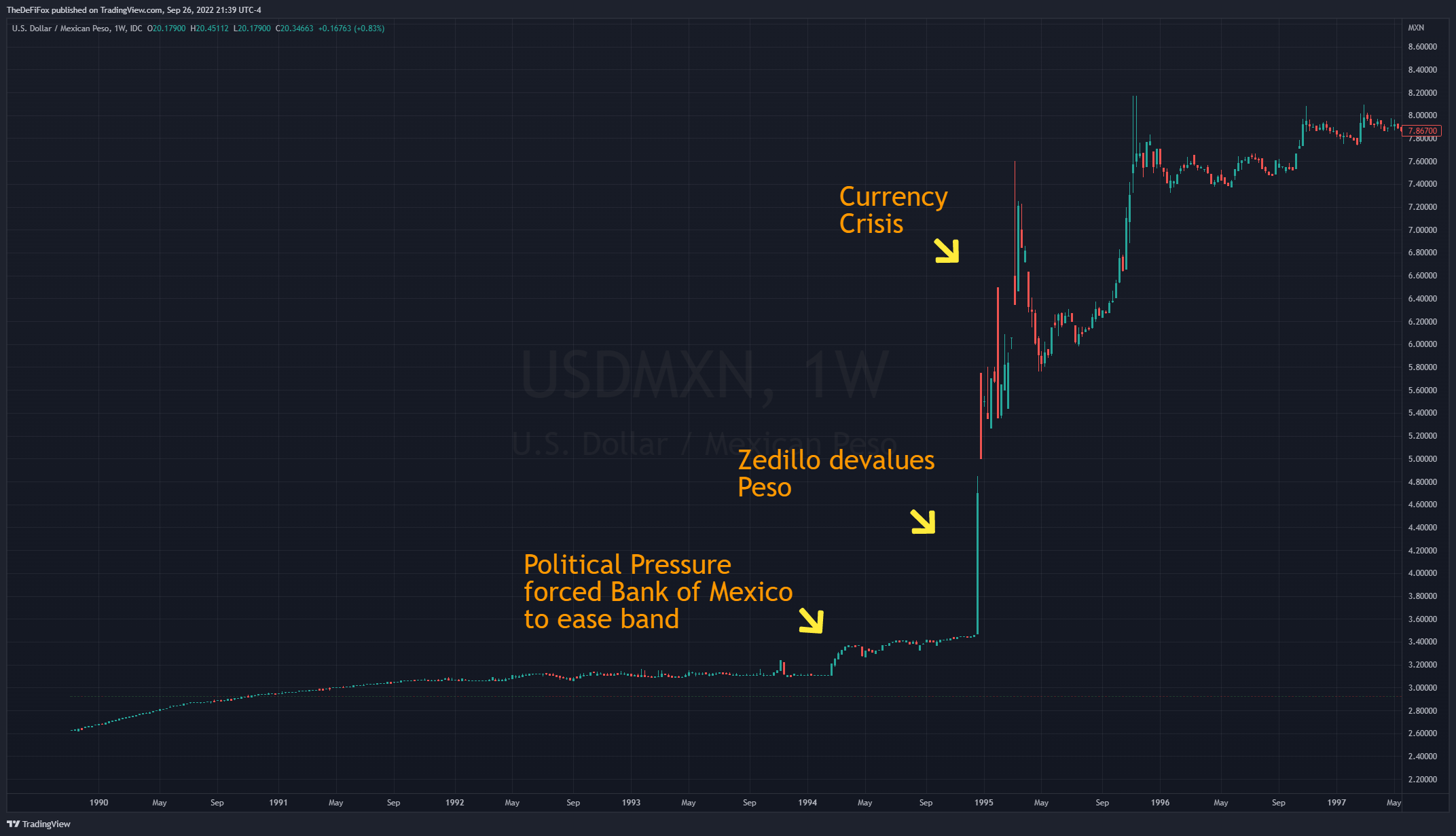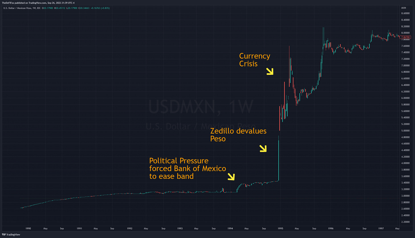 Another Crisis that was a consequence of the Volcker Fed that Greenspan proceeded to help bail out was the “Tequila Crisis’ or Mexican Peso Crisis. The high interest rates of the early 80s made it extremely difficult for Mexico to access funding from the US as investors bulked at the riskier Latin American investments versus parking assets in high yielding US treasuries. By 1982, Mexico defaulted on its IMF loans, and it was then essentially cut off from international finance markets, alongside the rest of Latin America.